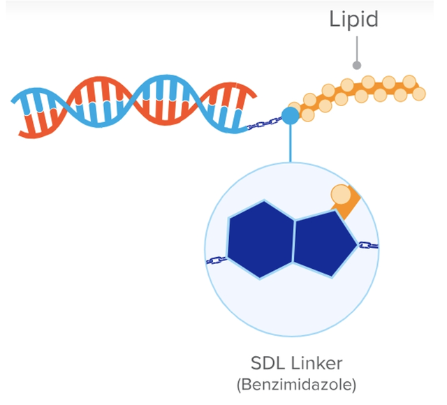 “评价一个递送系统优劣的关键,在于能否促使药物载荷(payload)及时从内吞体中逃逸出来,进入细胞质发挥作用。因此,SDL技术是我们递送系统最关键的核心技术之一,它不仅能实现灵活多样的核酸缀合,更能显著促进内吞体逃逸。”他解释说。